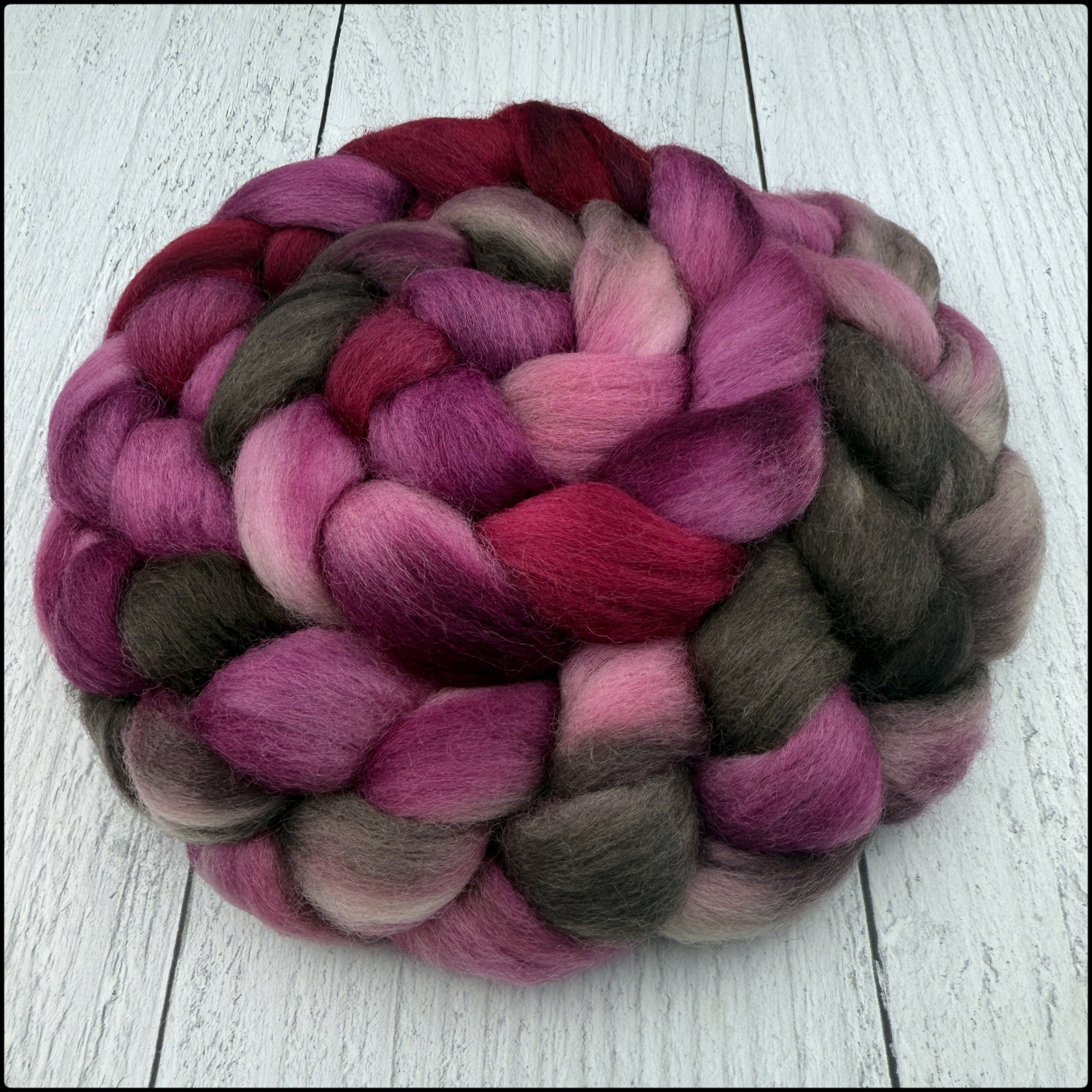 Commercially combed top; handpainted with professional washfast/lightfast acid dyes for hand spinning and felting. Please note that every effort has been made to fully exhaust any excess dye.